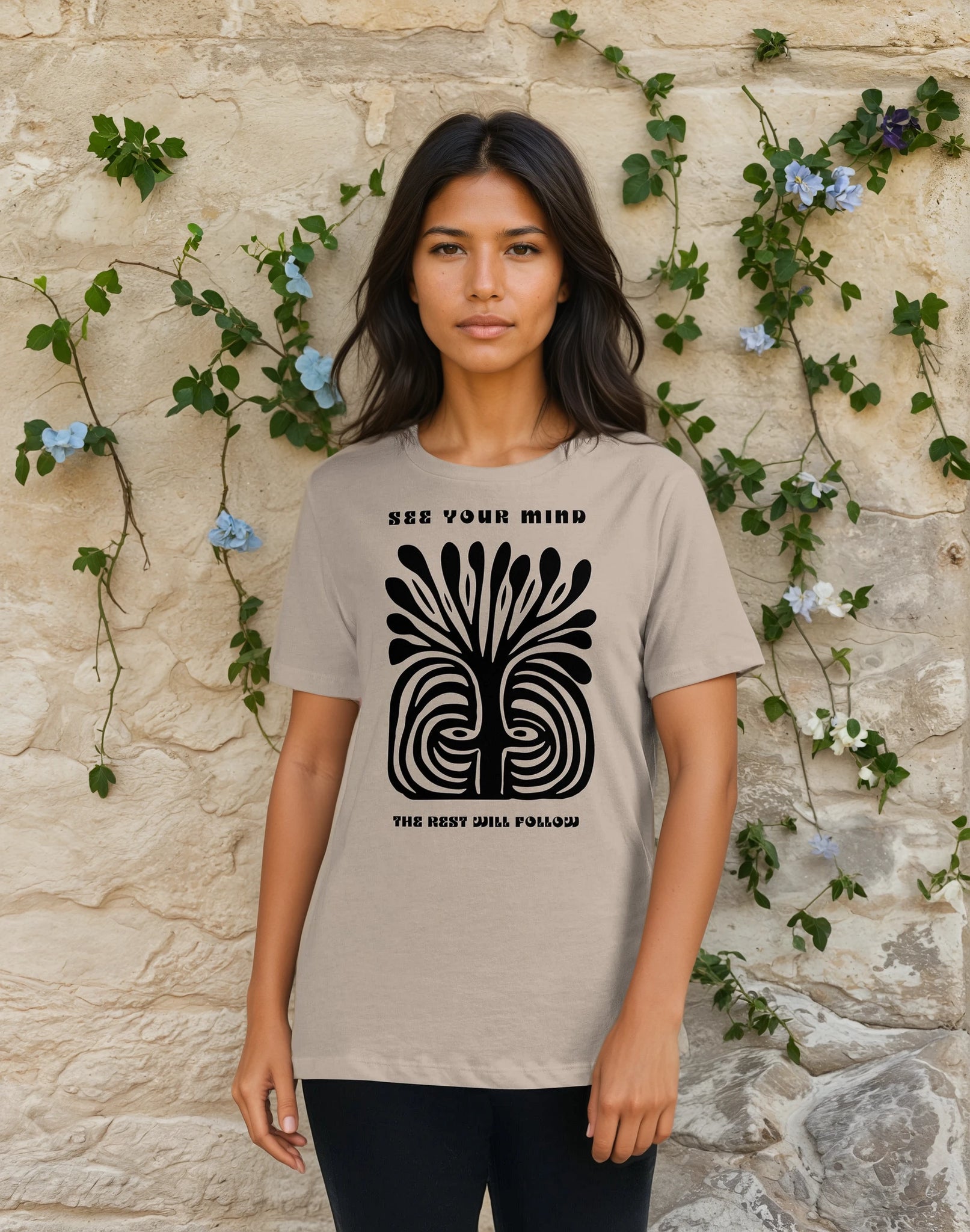 Freeing the mind begins with seeing the mind. This shirt offers a gentle nudge toward clarity, stillness, and the freedom that comes from awareness. A suggestion that meditation and mental fitness can lead to the root of happiness.